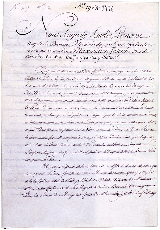 Anlässlich ihrer Heirat mit dem Stiefsohn Napoleons, Eugène, trat die bayerische Prinzessin Auguste Amalie aus der wittelsbachischen Erblinie aus. Dies entsprach den Gepflogenheiten, da die Erbfolge des angeheirateten Familienzweigs so ausgeschlossen werden sollte. Die Urkunde, mit der dies bestätigt wird, ist original unterzeichnet von Auguste Amalie, den bayerischen Ministern Maximilian Joseph von Montgelas, Theodor Heinrich Graf Topor Morawitzky sowie Johann Friedrich Freiherr von Hertling.