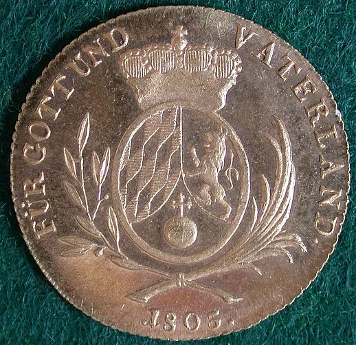 Konventionstaler mit dem Wappen des bayerischen Kurfürsten Max IV. Joseph und der Umschrift „FÜR GOTT UND VATERLAND 1805“