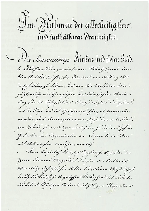 Dieses Dokument beinhaltet die Verfassung des Deutschen Bundes, der auf dem Wiener Kongress als lockerer Staatenbund der souveränen Fürsten und freien Städte Deutschlands gegründet wurde. Zweck war die Schutz der äußeren und inneren Sicherheit Deutschlands und der Unabhängigkeit und Unverletzbarkeit der einzelnen deutschen Staaten. Mit dem Bund sollte im Rahmen der konservativen Politik Metternichs sowohl die Gründung eines deutschen Nationalstaates als auch eine wirkliche Liberalisierung der innenpolitischen Verhältnisse der Mitgliedsstaaten verhindert werden. 1866 wurde er nach den Siegen Preußens über Österreich und die bundestreuen Staaten aufgelöst. Nachdem diese Vorentscheidung gefallen war, schuf Bismarck 1871 den deutschen Nationalstaat in Form der kleindeutschen Lösung, also ohne Österreich.