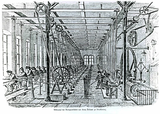 Arbeitssaal der Buntpapierfabrik von Franz Dessauer zu Aschaffenburg, Abbildung aus: Leipziger Illustrierte, 1849 Druckgrafik, Holzschnitt auf Papier |