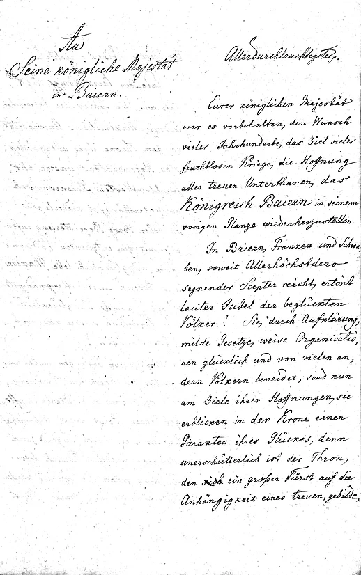 "An Seine Königliche Majestät in Baiern. Eurer königlichen Majestät war es vorbehalten, den Wunsch vieler Jahrhunderte, das Ziel vieler fruchtlosen Kriege, die Hoffnung aller treuen Unterthanen, das Königreich Baiern in seinem vorigen Glanze wiederherzustellen.