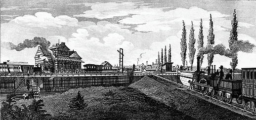 Kreuzung der Bamberger Strecke mit der Bahnstrecke Nürnberg–Fürth, um 1844–1850 Stahlstich |