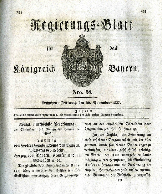 „Königliche Allerhöchste Verordnung, die Eintheilung des Königreichs Bayern betreffend“, in: Regierungs-Blatt für das Königreich Bayern, Nr. 58, 29. November 1837, Sp. 793–800 Druck auf Papier |