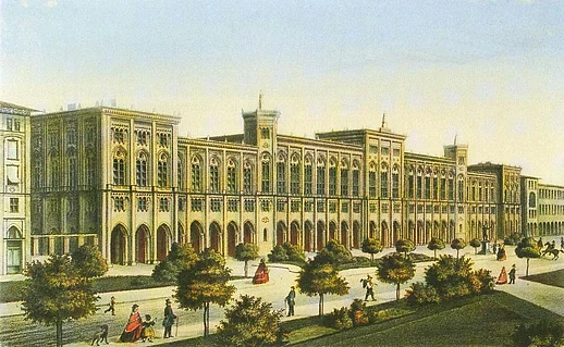 Regierungsgebäude in der Maximilianstraße in München, 1858 bis 1864 erbaut von Georg Friedrich Christian Bürklein (1813–1872) Jobst Riegel (1821–1878), 1870 Radierung, koloriert |