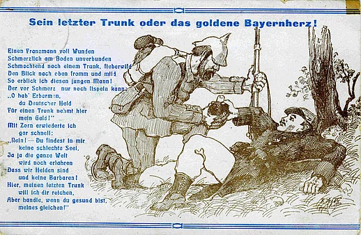 Ein bayerischer Soldat reicht einem verwundeten französischen Soldaten seine Feldflasche.